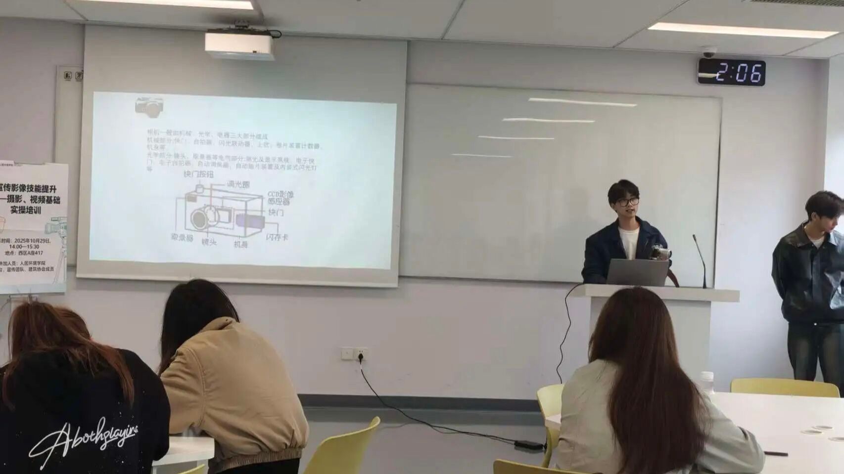 培训中,林福望学长从“学生党常用设备怎么拍好宣传照”切入,避开复杂理论,直接拆解“三分构图拍活动场景”“利用教室自然光拍素材”等实操方法,还现场用相机演示调整角度、优化画面的小技巧;陈玮学长则聚焦视频创作痛点,针对“剪视频没思路”“素材杂乱难整理”等问题,分享自己常用的剪辑软件基础功能。