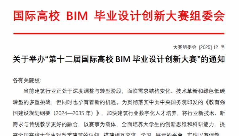 为深入贯彻落实党的二十大以及中共中央国务院印发的《教育强国建设规划纲要(2024—2035年)》关于加快建设教育强国、科技强国、人才强国的重要部署,加快建筑行业数字化人才培养,将行业新技术、新需求与传统教学更好的融合,以赛事为载体,全面培养大学生的创新思维和科研能力,提高全国高校大学生对数字建筑的认知,搭建相互交流、学习、展示的平台,实现以赛促教、以赛促学、以赛促创,决定举办“第十二届国际高校BIM毕业设计创新大赛——常规赛道校园赛”。