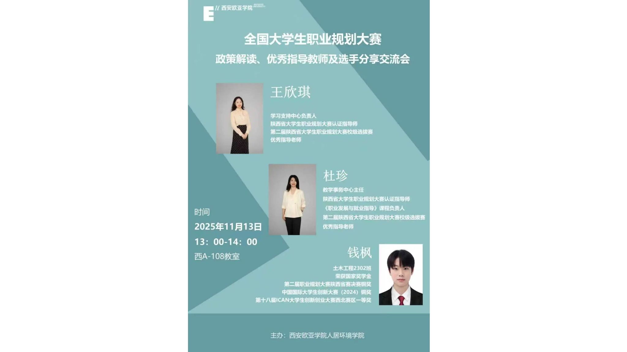 为落实就业工作部署、强化生涯教育,人居环境学院举办大学生职业规划大赛院级选拔赛。大赛旨在以赛促学、促教、促就,引导学生科学规划职业,提升就业竞争力,推动高质量就业。从自我剖析到赛道选择,从材料打磨到现场展示,人居环境学院大学生职业规划大赛的每一步都藏着“用心”的密码。人居环境学院为各位同学能够发挥出最好的状态,特地开展分享交流会,把院赛截止节点、双赛道评分细则、PPT制作技巧进行分享。海报展示 王欣琪老师分享杜珍老师分享钱枫同学分享。在2025年11月27日,人居环境学院大学生职业规划大赛决赛精彩启幕!本次大赛设置成长赛道与就业赛道,正是为了给不同发展方向的同学们,搭建一个展现实力、交流思路、锚定目标的平台。我们期待通过这个舞台,点燃大家对职业规划的热情,挖掘个人成长与职业发展的潜力,助力每一位同学清晰方向、稳步前行。方放副院长表示希望大家在比赛里讲清职业思考、收获成长启发,不管是长期沉淀还是精准适配,只要找准方向踏实向前,每份规划都会是职业路上的“铺路石”,预祝各位选手赛出风采,把今天的规划变成未来的扎实行动!