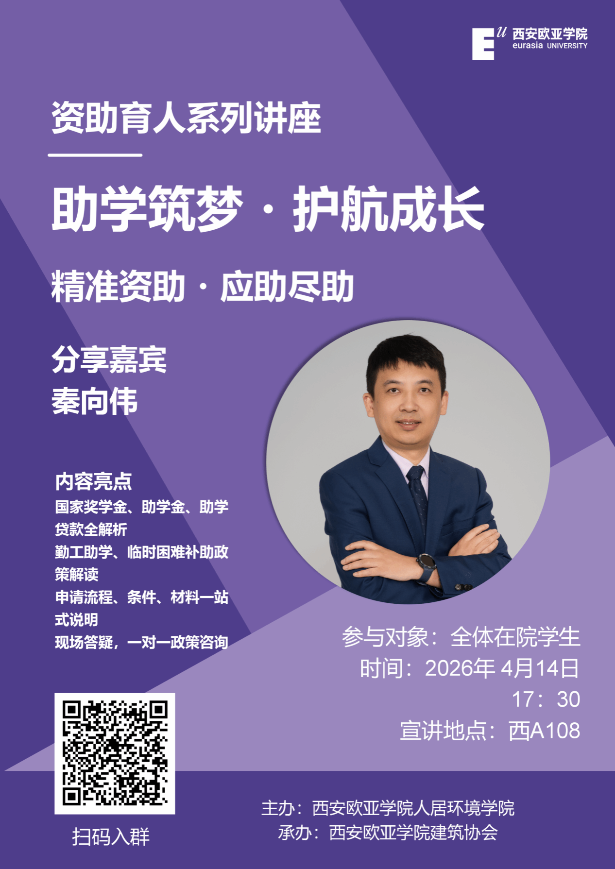 为全面落实国家与学校各项资助政策,切实帮助学生清晰了解奖、助、贷、勤、补等资助体系,解决资助申请中的实际困惑,西安欧亚学院人居环境学院于4月14日17:30在西A108顺利开展资助政策宣讲会。本次宣讲面向全院在院学生,围绕资助政策解读、申办流程梳理、注意事项提醒三大核心内容展开,用详实干货、清晰指引、贴心服务,把资助政策送到每一位同学身边,以精准资助助力学子安心求学、逐梦前行。