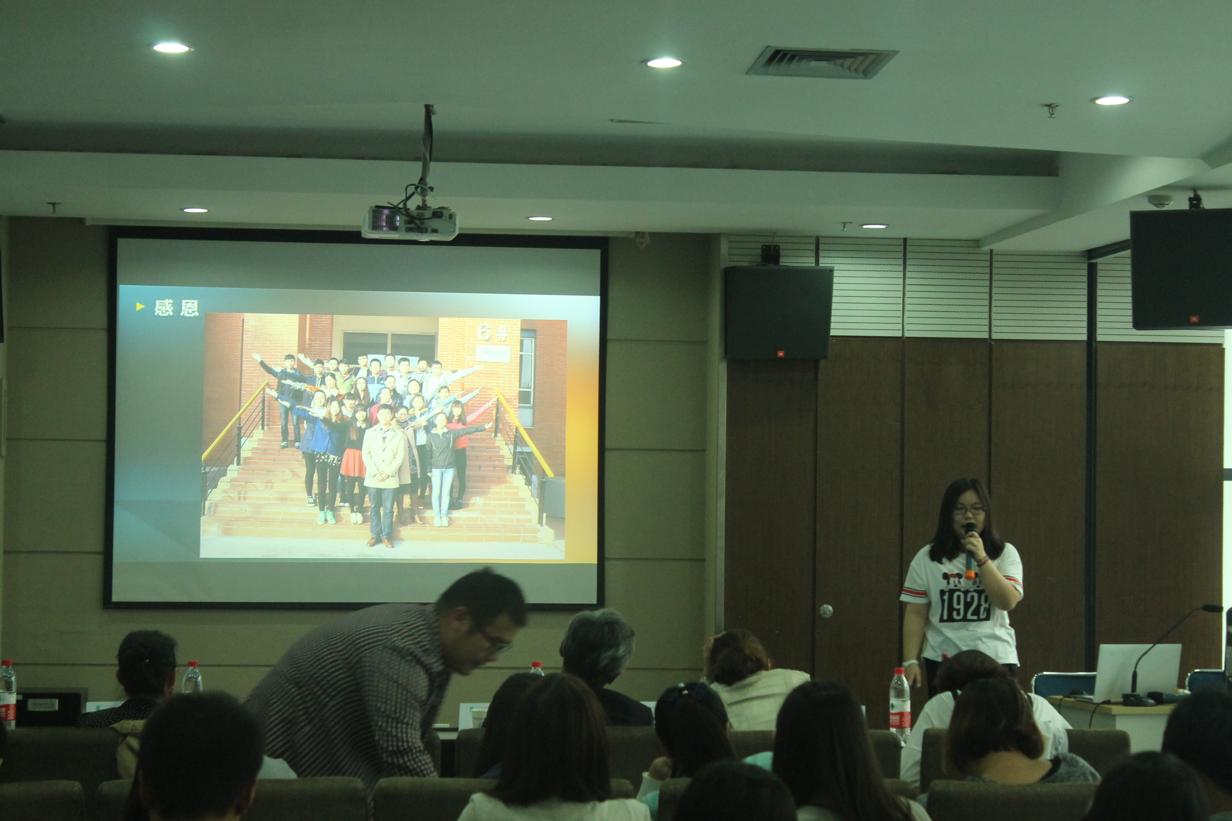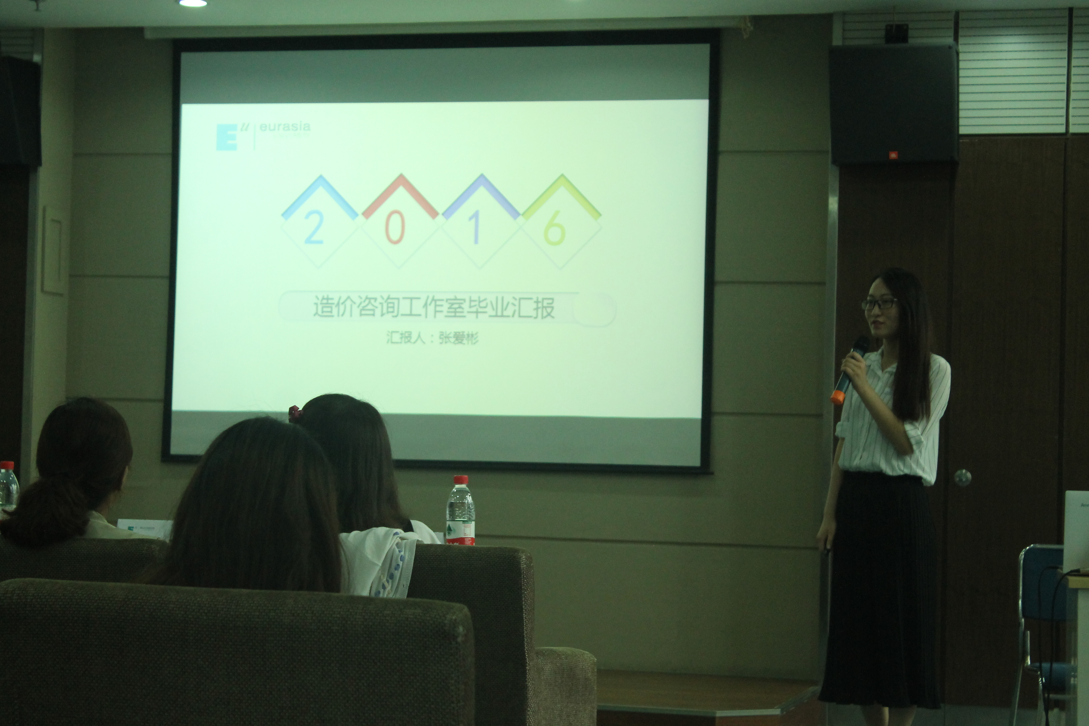 本次毕业汇报由造价工作室13级成员梁思源主持,首先由我们造价工作室的代表张爱彬、席颖茹,成喆三位学姐分别发言,三位学姐带我们回顾了工作室的发展历程,介绍了我们工作室的老师们——可爱的董婧老师,优雅的邹继雪老师,帅气的张磊老师,还有王群、王霞老师。三位学姐都感慨:“没有工作室和这些老师们,就不会有现在的自己!”张爱彬学姐和我们分享了她的学习历程:从广联达大厦到小组合作完成城中村的17层,再到独立完成31层的毕业设计。她说:“因为之前在工作室的磨练,所以毕业设计对她来说so easy~”席颖茹学姐和我们分享了她的第一篇通讯稿,是她的第一次翻转课堂,通过这个她掌握主动权,自主学习,增强沟通能力,增加自信。而成喆学姐给人印象最深的是她最后的哽咽,看的出她对工作室的感情,她选择以《see you again》来结束她的发言想来也是想再多看工作室一眼,再多看工作室一眼,再多看并肩作战三年的小伙伴们一眼,让分别来的再晚一点,再晚一点。