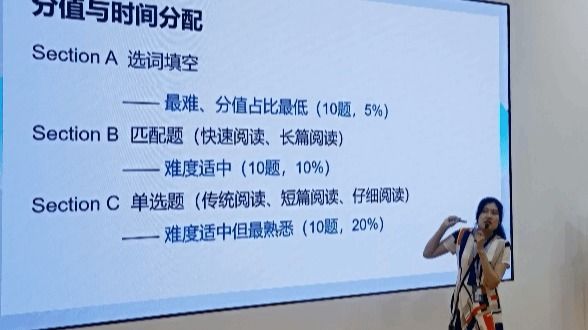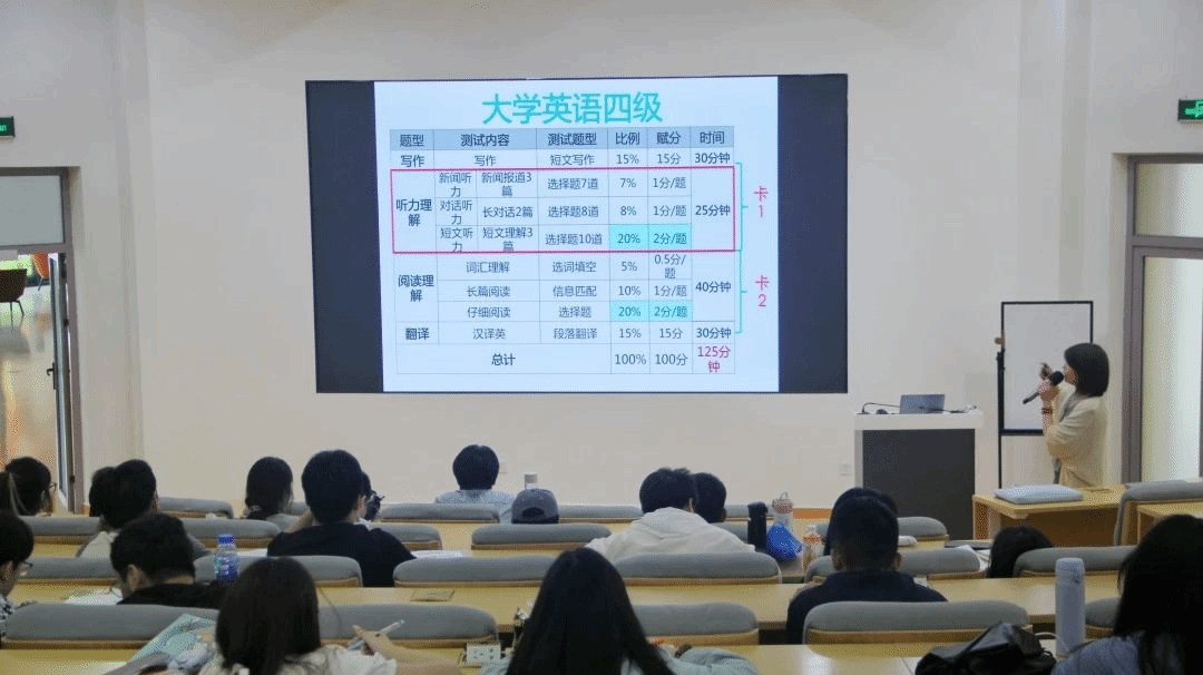 本系列讲座内容涵盖四级听力、阅读、写作和翻译,讲练结合,旨在帮助学生熟悉考试题型,掌握应试技巧,全面提升同学们的英语综合能力。讲座也注重学生的参与和体验,设置丰富的互动环节,让同学们在轻松愉快的氛围中学习英语,提高学习兴趣和积极性,具体安排如下:讲座伊始,赵甜甜老师首先强调了四级听力考试的重要性和难点,并分析了听力部分在四级考试中的分值占比和题型特点。赵老师选取2023年12月第一套四级真题作为听力材料,进行实战演练,让同学们熟悉考试流程,掌握答题技巧。赵老师详细介绍了四级听力应试策略和技巧,包括预览选项、抓住关键信息、排除干扰项等。同时,赵老师还分享一些提高听力水平的实用方法,如听力材料的选取、听力练习的频率和方式等,帮助同学们在有限的时间内快速提高听力能力,为四级考试做好充分准备。四级阅读专题讲座分两次进行,分别由聂彩兰和于恩明老师主讲。聂彩兰老师首先对四级阅读模块进行了介绍,包括考试题型、分值分布、时间分配等。随后,聂老师详细分析了选词填空和长篇阅读两种阅读题型的特征、解题步骤和注意事项,提出了非常实用的解题技巧和方法。聂老师强调,提高阅读速度和准确性是取得高分的关键,因此同学们平时要注重词汇积累、语法理解和篇章结构分析等方面的训练。在讲座过程中,聂老师结合历年真题进行了详细解析,让学生们更加直观地了解四级阅读考试的命题趋势和出题规律。