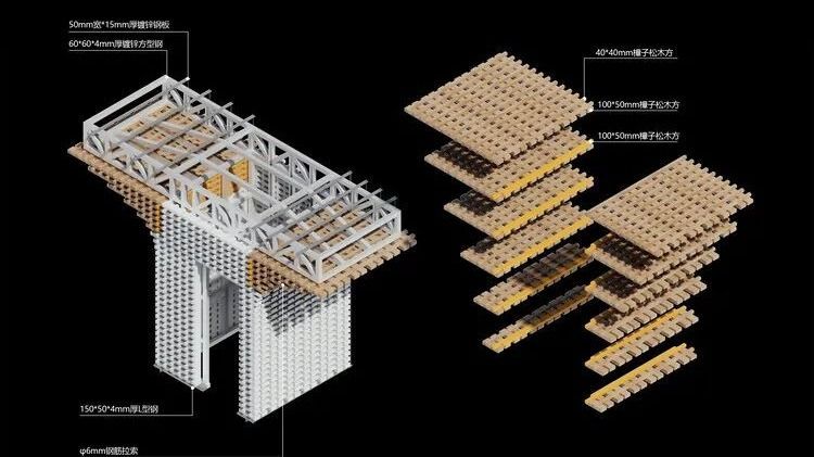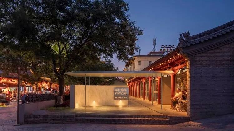 榆林古城位于陕西省北部,始建于明朝。自明朝伊始,就是中国重要的九边重镇之一。古城城墙保存完整,城内古色古香。尤其是贯穿古城南北的中心大街,六座古楼骑街而立,被称为“六楼骑街”。它与城南的凌霄塔,城北的镇北台,共同构成了古城“南塔北台中古城,六楼骑街天下名”的历史空间格局。2022 年,榆阳区政府联合 CBC 建筑中心发起“相约榆林,对话古城”榆林古城改造更新计划。土木石受邀对位于南大街镇远门旁的工贸院进行整体改造,将原有的小型商业功能整体转化为提供游客服务和古城更新体验的文化场所。土木石希冀于设计首先能根植于历史,是古城历史文脉的延展与转译。同时能立足当代,利用空间和场地本身的特点创造一个适应日常活动的场所,从而能激活并带动整个古城文化生活的发展。南门工贸院是一个 2006 年建的仿古风格的四合院。改造是将工贸院室外场地、临街商铺和地下超市转化为户外休憩庭院、游客服务中心和老城更新体验厅。基于这三个部分,改造提出了“树院、街房、城展”的设计策略。这三个策略既是对小尺度空间设计是否能与城市、街道、场地之间产生文脉上联系的实验性尝试,同时也是回应了设计对这三个场地本身特质的思考和挖掘。树院树院”是南门工贸院朝中心大街一侧宽27米,进深8米的矩形场地,场地内的三颗国槐,枝繁叶茂,几乎遮盖住了整片场地。设计首先将场地整体抬升,使场地与游客中心室内地面保持同一高度。这样,既将原有大尺度且仅有通行作用的街道划分成了宜人尺度的街院格局,同时也将游客中心室内外连成一个整体,使游客服务的功能得以外化。于此同时,设计围绕场地中三棵国槐展开。南侧的国槐结合弧形的清水混凝土矮墙和轻质金属雨棚形成引导进入地下更新体验厅的入口。中部的国槐结合抬升的花池,形成上升至游客中心室外休闲区的踏步以及无障碍坡道。北边的国槐结合弧形的清水混凝土矮墙形成进入游客服务中心的入口。铺地材料选用古城拆迁回收的厚重老砖,与通透轻薄的落地玻璃窗形成新旧对比,并在树荫下摆放固定外摆座椅,形成能让游客及古城居民休憩的“树院”场所。