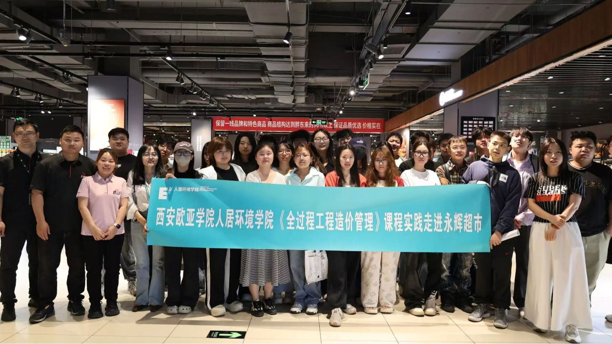 《全过程工程造价管理》课程聚焦建设项目全生命周期造价管控,系统讲解投资决策、设计、招投标等知识要点,通过案例分析与理论结合,培养学生全过程成本控制思维与工程量计算、计价规范应用等核心技能。为深化教学实践,强化“新工科+新商科”跨学科人才培养模式,4月27日(周日),课程老师带领22级工程造价双语班学生,赴西安永辉超市阳光天地店(“爆改完”门店)开展课程实践教学。师生通过品鉴活动与调研,学习永辉选品标准、新零售运营理念,解码商业空间调改中的动态成本逻辑,体验系统经营管理模式与运营操作实际。Section1探索永辉超市的变化永辉超市负责人:“永辉超市借鉴胖东来的理念,展开多方面革新。在商品层面,深入调研消费者需求,优化商品结构,增添众多一二线品牌商品,满足不同层次的消费需求。我们把顾客当家人。设置便民服务区,提供免费测量血压、身高体重等,为了更好的让老年人看清商品基本信息,在货架的两端设置了放大镜以便需要。”“装修也做了改变,整体风格简约大气,降低货架高度、拓宽购物通道,取消了强制动线,营造开阔舒适的购物空间。员工管理层面,为了让员工能兼顾生活与工作,以更饱满的热情投入服务,合理安排了工作时长并增加带薪年假力求全方位为消费者带来优质体验 ”。