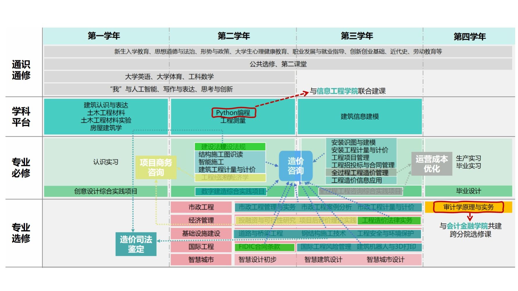 第一年(造价基础应用+启蒙课程)【核心课程】“我”与人工智能、建筑认识与表达、土木工程材料、房屋建筑学、职业发展与就业指导【实践项目】创意设计综合实践项目、认识实习【特色模块】行业初认知讲座、英语能力提升、职业素养工作坊、创新创业训练第二年(造价技能应用+实操课程)【核心课程】建筑工程计量与计价、结构施工图识读、工程测量、建设法规、智能施工、Python编程、工程经济学【实践项目】数字建造综合实践项目、工程经济学课程设计、建筑工程计量与计价课程设计【特色模块】行业能力培养工作坊、工作室培训、国家级大赛训练第三年(全过程造价应用+案例课程)【核心课程】全过程工程造价管理、工程造价信息应用、建筑信息建模、工程项目管理、安装识图与建模、安装工程计量与计价、工程招投标与合同管理【实践项目】全过程工程咨询综合实践项目【特色模块】丝路沿线国家及项目重点区域游学、国际证书考取、国际工程模块、经济管理模块、基础设施建设模块、市政工程模块课程、工程审计、造价司法鉴定第四年(造价综合应用+职业实践课程)【实践项目】企业带薪顶岗实习、职业链接课+毕业设计【特色模块】专业讲座、海内外升学及就业指导、小语种辅导、留学院校申请、考公考编训练+面试指导。课程地图。就业前景毕业生可在国内外工程建设行业从事造价咨询、企业运营成本优化、项目商务咨询、造价司法鉴定等领域担任核心技术岗位,行业前景广阔,薪资领跑行业。