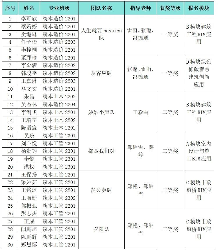 1. 赛事速览由:中国建设协会主办的2025年「鲁班杯」全国高校数字孪生创新应用大赛共有215所高校、1008支参赛队伍报名参赛,涉及11个赛项,我院学子报名A、B、C、D四个模块团队赛,其中A、C、D模块为首次参赛。我院学生凭借扎实的专业知识、创新的思维能力和出色的实践能力,在激烈的全国竞争中脱颖而出,共斩获6项国家级奖项,其中包括全国一等奖2项、二等奖2项、三等奖2项!这一骄人战绩充分展现了我院在数字孪生技术应用与创新人才培养方面的卓越成效!获奖名单: 6支参赛团队、共计30名学生获奖!